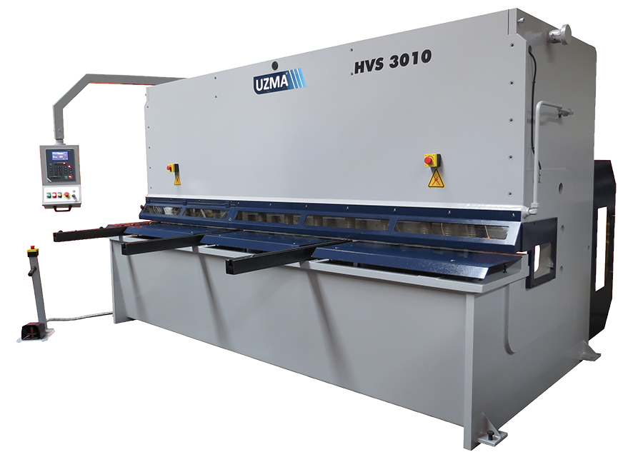 Hydrauliczne nożyce gilotynowe CNC UZMA HVS 3010 o zmiennym nachyleniu noży są wyposażone w jednostkę sterującą CNC. Po wprowadzeniu przez operatora rodzaju materiału, grubości, długości cięcia oraz szerokości cięcia, system CNC automatycznie obliczy i ustawi szczelinę między nożami, odpowiednio ustawi kąt natarcia i pozycję tylnego zderzaka.