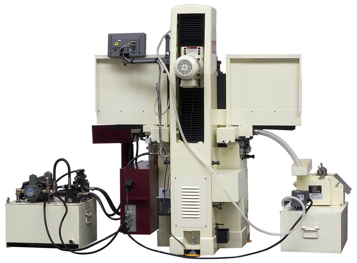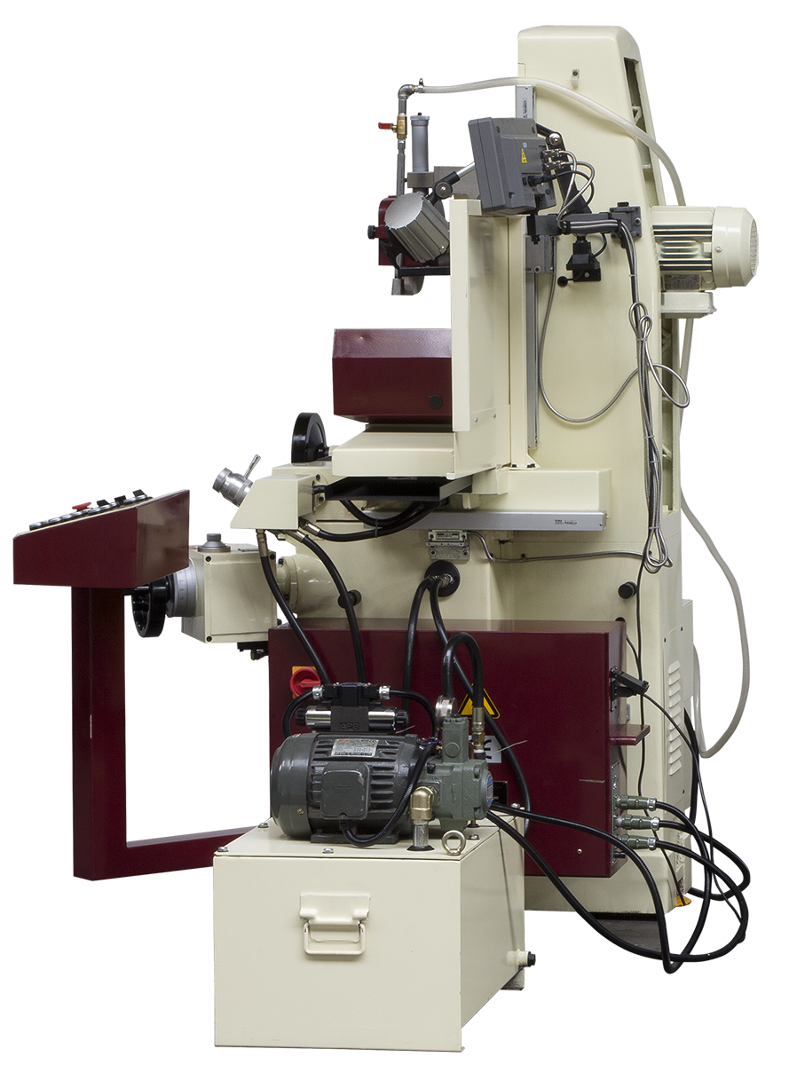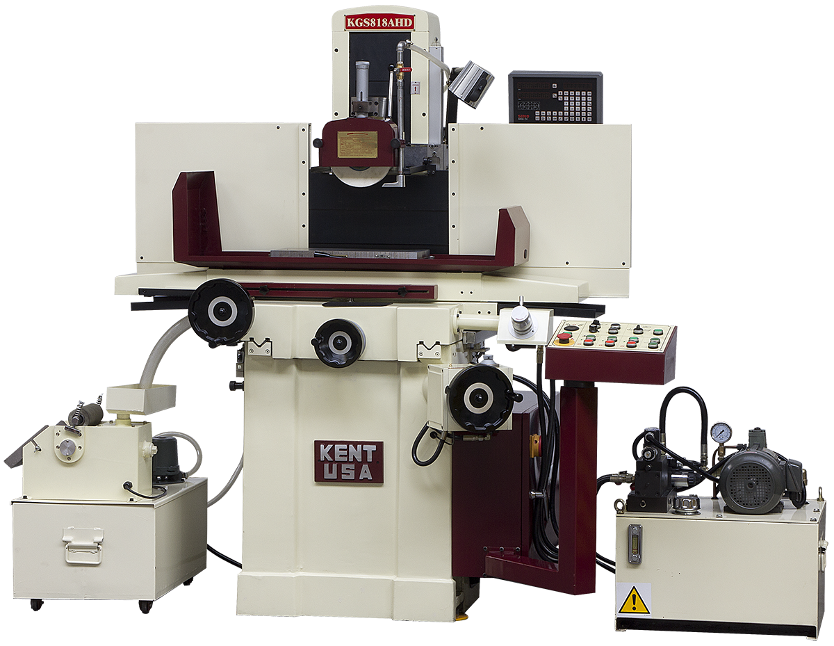 Automatyczna szlifierka do płaszczyzn KENT USA KGS 818 SD1/SD2 wyposażona w sterownik PLC Siemens oraz serwomotor Siemens odpowiedzialny za sterowanie przesuwem pionowym wrzeciennika (oś Z). Automatyczny posuw pionowy wynoszący 0,001-0,1mm/przejście oraz podziałka 0,01 dla posuwu poprzecznego (oś Y) zapewniają możliwość prowadzenia obróbki szlifowania zgrubnego, wykańczającego i wyiskrzania w jednym cyklu roboczym. Śruba kulowa osi Z - produkcji tajwańskiej, śrubowa kulowa osi Y - produkcji chińskiej.